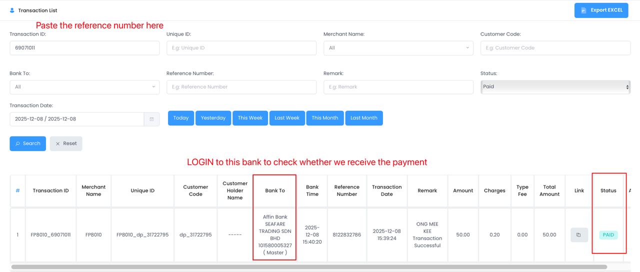 Before providing the INFO to the merchant refer, please refer to the TELEGRAM merchant’s receipt to match the information, you can compare (status, amount,Merchant Name, Remark,) via RAPIDPAY for checking