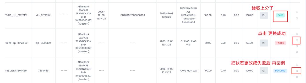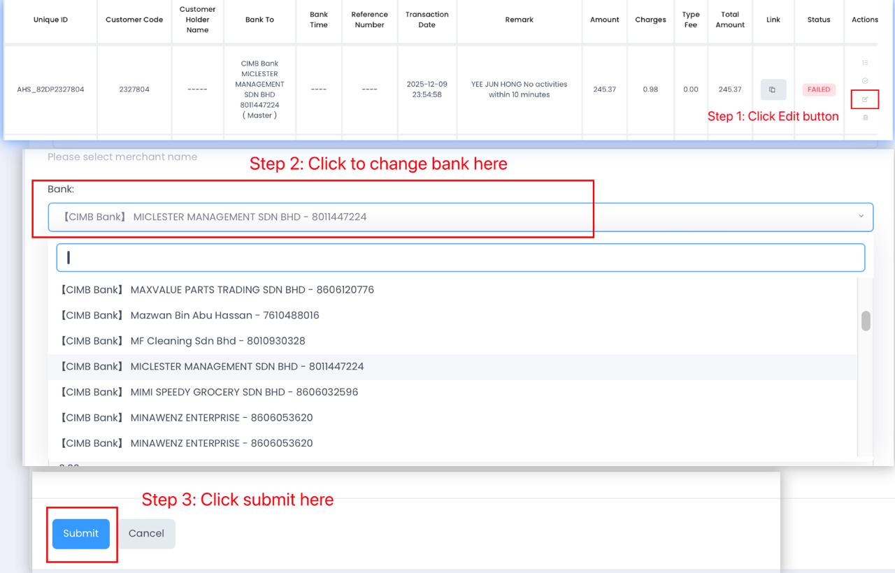 - Click > Status change fail > Search again the relevant transaction ID > Click to direct manual update