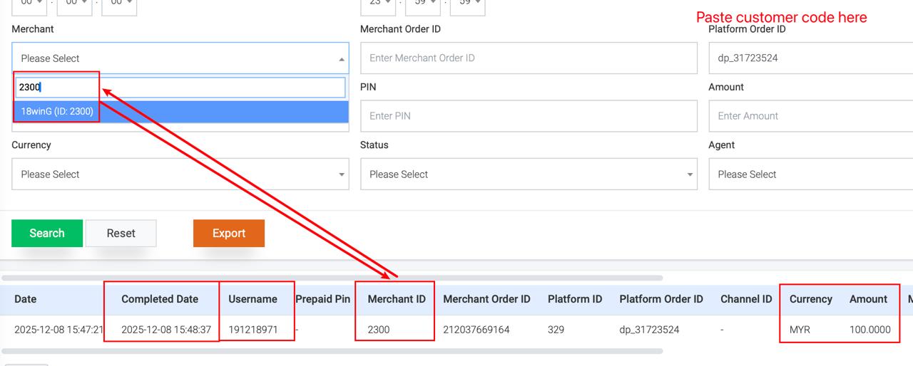 In FPAY/VPAY system → Order List → Paste USERNAME / MERCHANT ORDER ID field. ( either Merchant Order ID or Member Username)