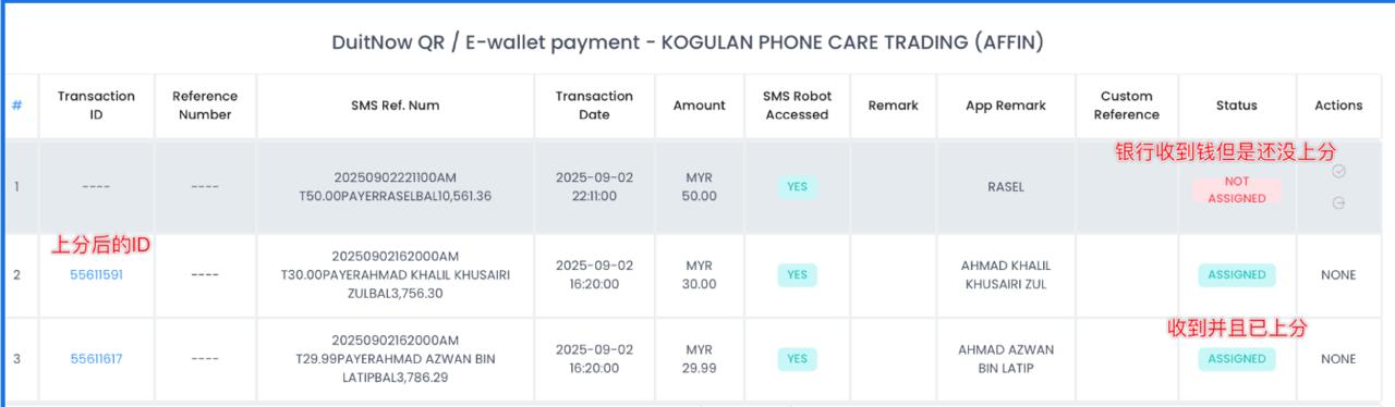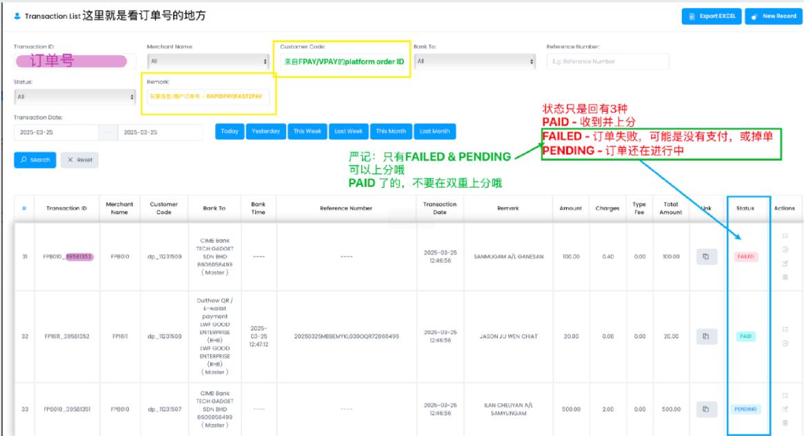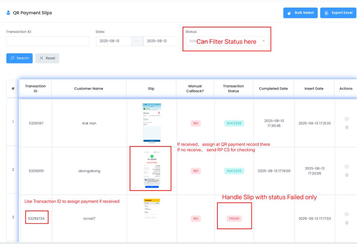 Only check transactions marked as “FAILED” (means the system has not auto-updated). For these, CS must manually check and assign.