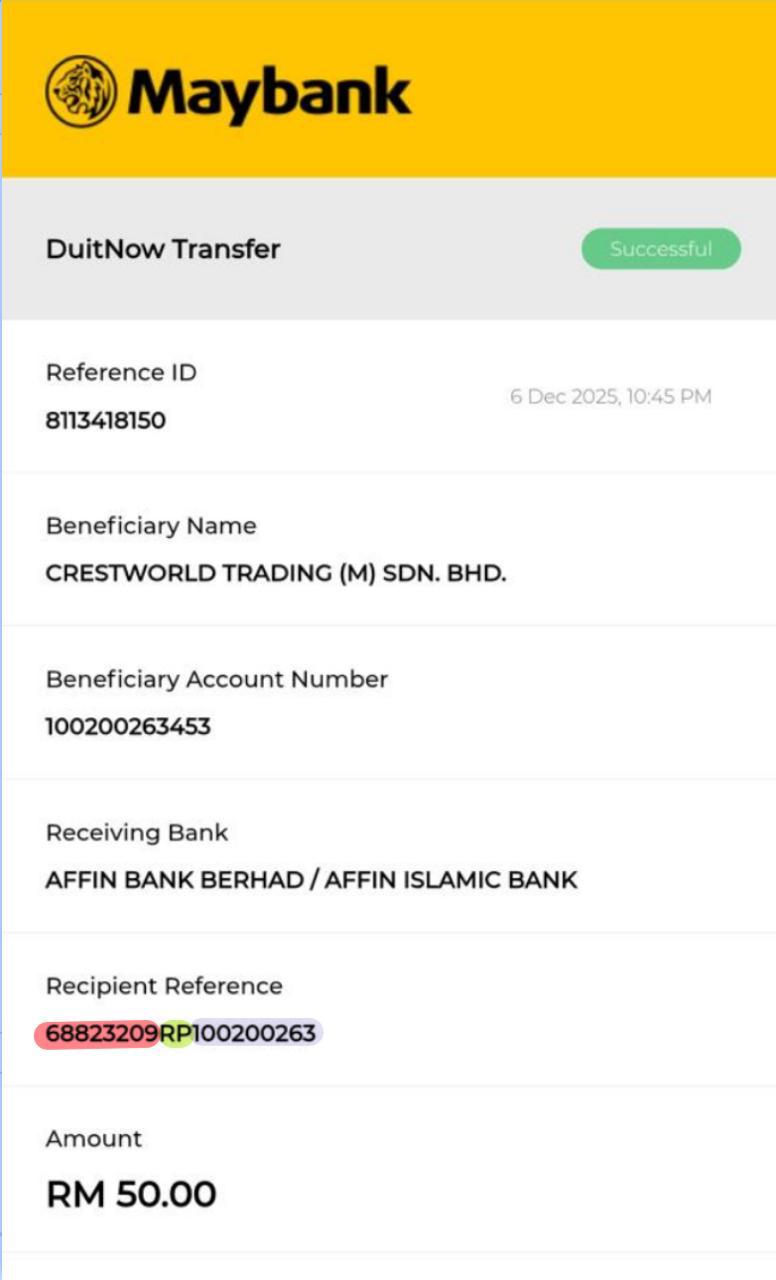Supported Banks: Malaysia Mobile Banking App, Grab, Touch N’Go, Boost