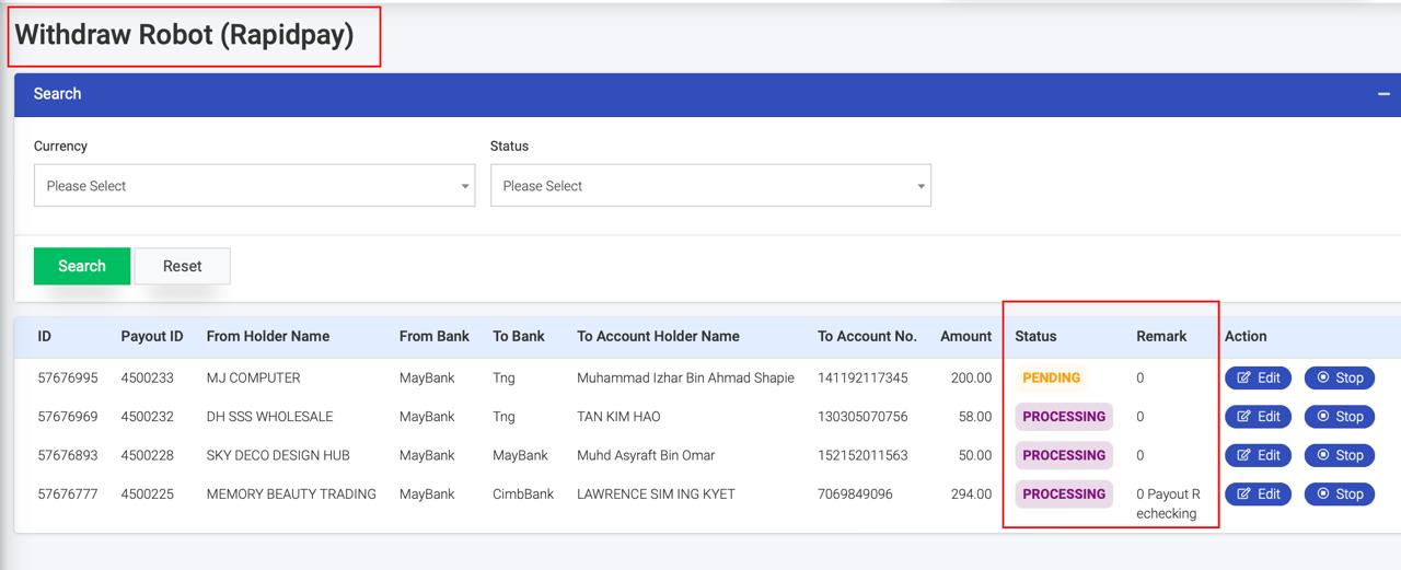 Processing : Need do further check in FPAY – Withdrawal Robot (RAPIDPAY)