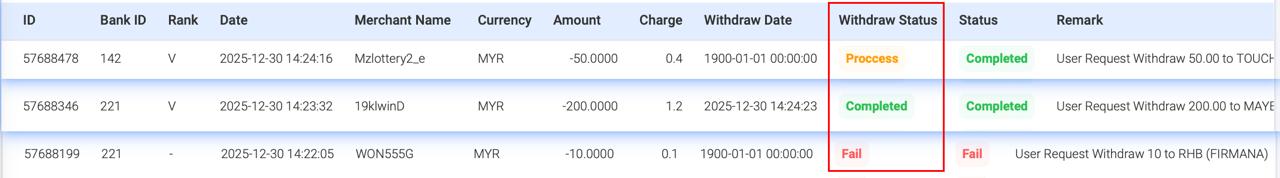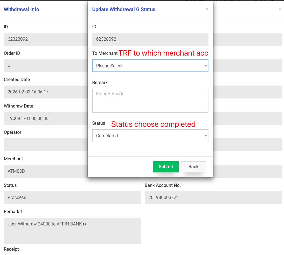 - Back to FPAY → Withdrawal List G → View → Update Status → Change to “Complete”
