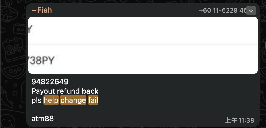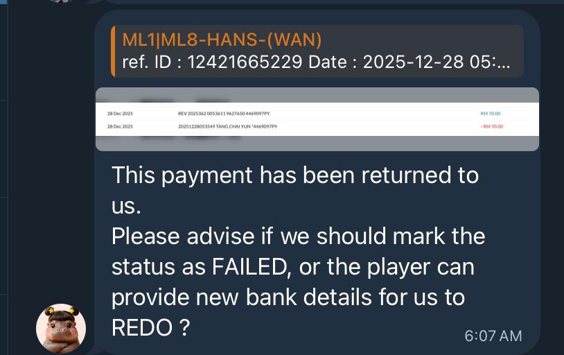 Message Example: This payment has been returned to us. Please advise if we should mark the status as FAILED, or the player can provide new bank details for us to REDO ? 这笔款项已退回到我们这边。请问是要将状态标记为 FAILED,还是玩家会提供新的银行资料以便我们重新出款?
