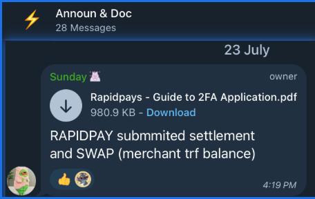 - Go to Fpay CS > Announ and Docs > Get the file (Rapidpays – Guide to 2FA Application) and send to merchant
