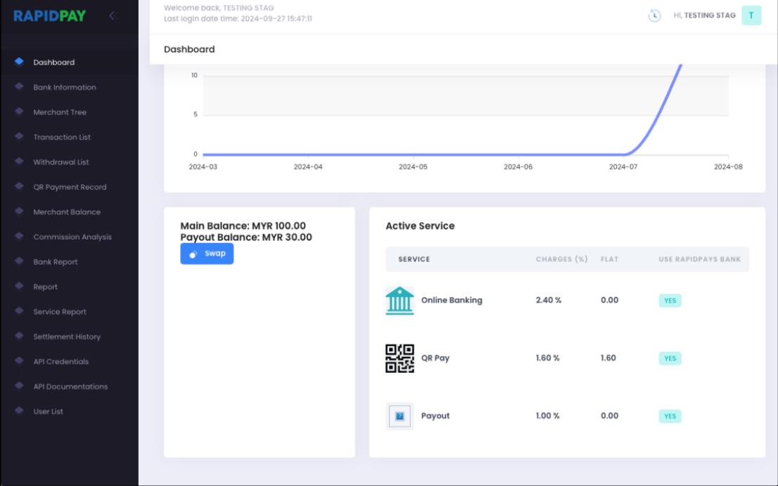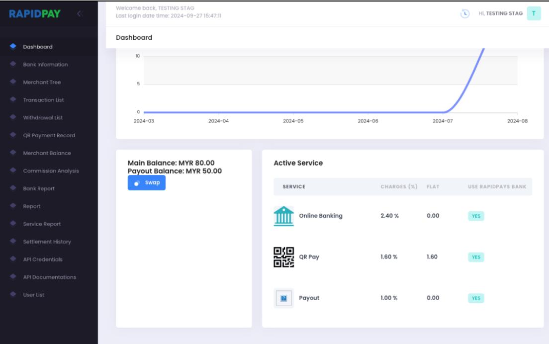 1. Login to Rapidpays backend at https://merchant.globalpayshop.com/. From dashboard, there are two balances showing: Main Balance (balance from deposit and can be proceed to settlement) & Payout Balance (balance only shown if you’re payout service subscriber)