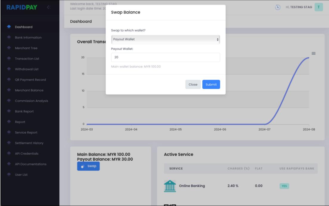 - For payout service subscriber, balance swap can be performed by clicking “Swap”. Select the destination wallet from the list and the balance available to swap will be showing below the space for inserting amount. Proceed with clicking “Submit”.