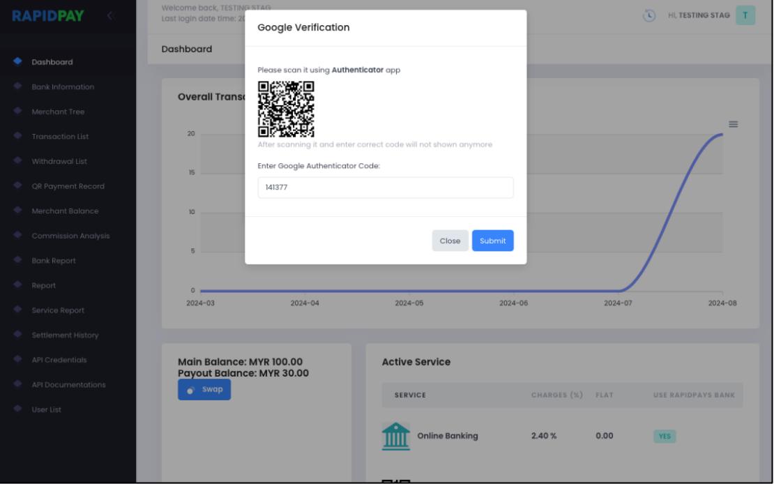 3. For First Time performing “Swap” or “Request Settlement”, the Google Authenticator code to bind on your phone will be showing as below. Scan the code using your Google Authenticator app, enter the code showing after the code added to your app. Click “Submit”.
