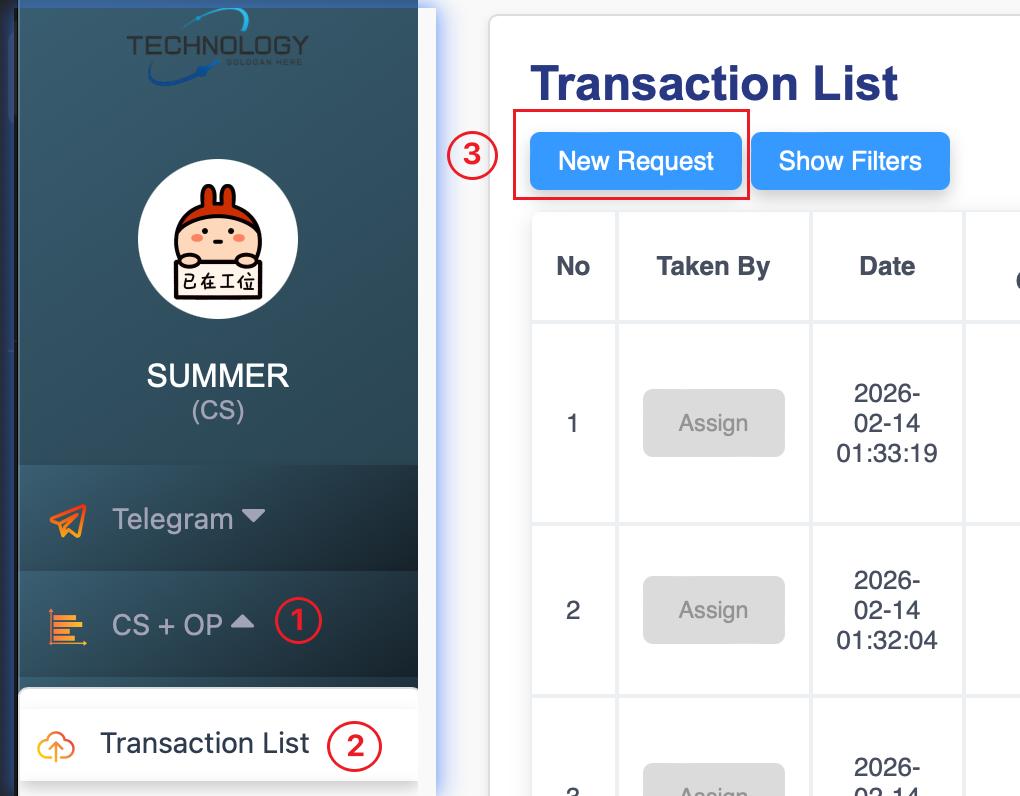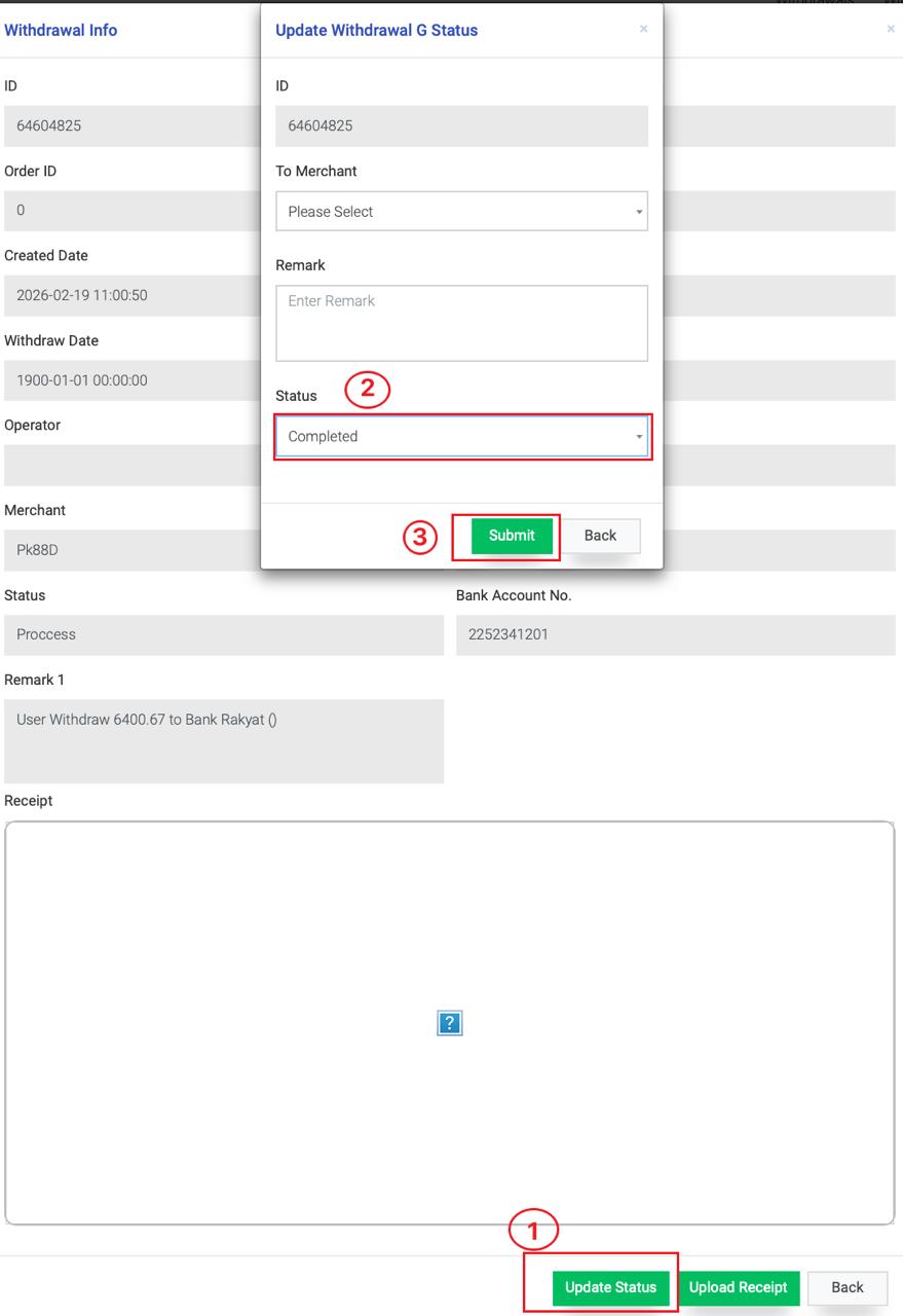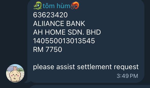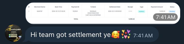 1. Merchant submits a withdrawal/settlement request. The request will announced in the Telegram group.