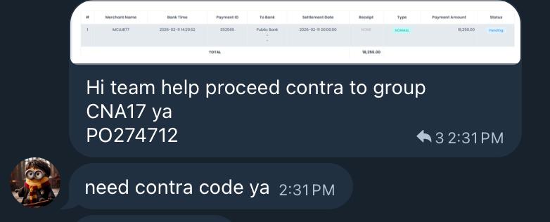 1. Merchant submits a contra request. The request will announced in the Telegram group.
